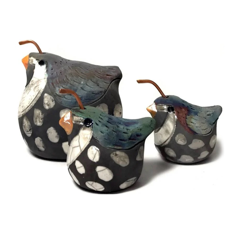 These rustic, raku-fired quail sculptures are handmade by Northern California ceramicist Barbara Prodaniuk. Whether small (approx 3"H x 4"L) or large (5"H x 5"L), each has its own handcrafted personality and will vary a bit from what's pictured.