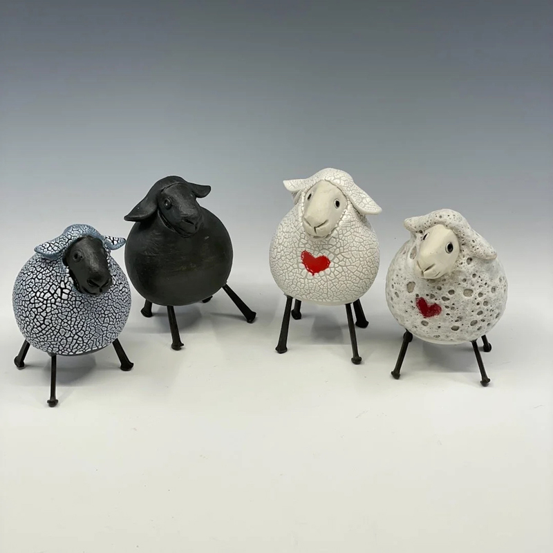Handmade porcelain sheep with a variety of glazes and faces, some with a heart. These delightful figures are sure to bring joy. Available in different colors. Square nails are used for the legs, and they measure about 4” x 4”.
